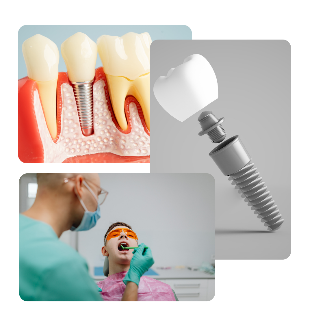 Es un pequeño tornillo de titanio biocompatible que sustituye la raíz del diente perdido.Sobre él se coloca una corona que imita la forma, color y función de un diente natural.